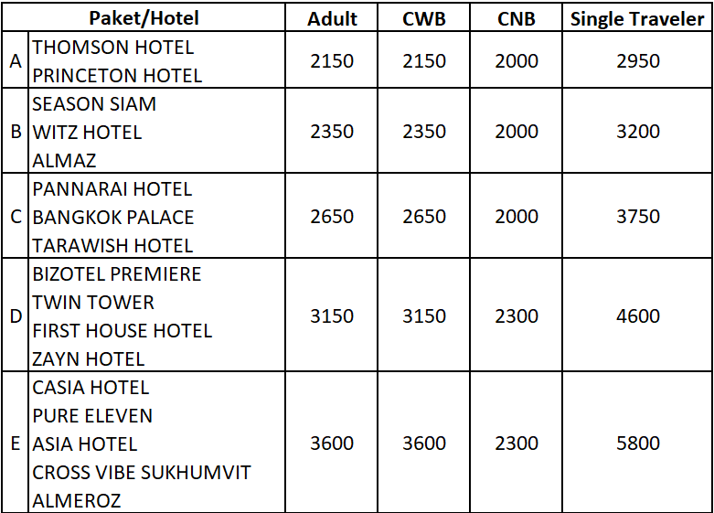 - Akomodasi 2 malam di Bangkok , 1 malam pattaya