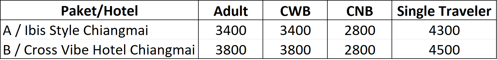 Tiba di Bandara Chiang Mai. Setelah cap paspor di imigrasi Thailand. Anda akan bertemu dengan perwakilan kami di pintu keluar. Anda akan ditransfer ke hotel untuk check in dan acara bebas.