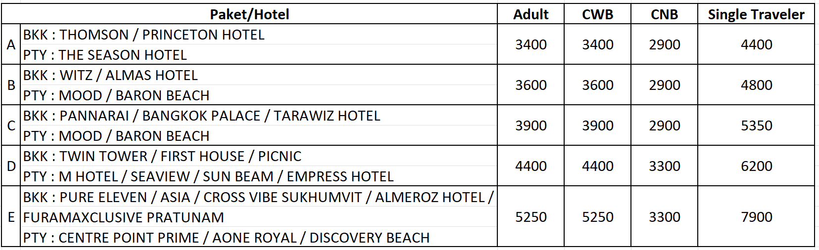 - Akomodasi 2 malam di Bangkok, 2 malam Pattaya