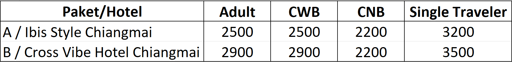 Tiba di Bandara Chiang Mai. Setelah cap paspor di imigrasi Thailand. Anda akan bertemu dengan perwakilan kami di pintu keluar. Anda akan ditransfer ke hotel untuk check in dan acara bebas.