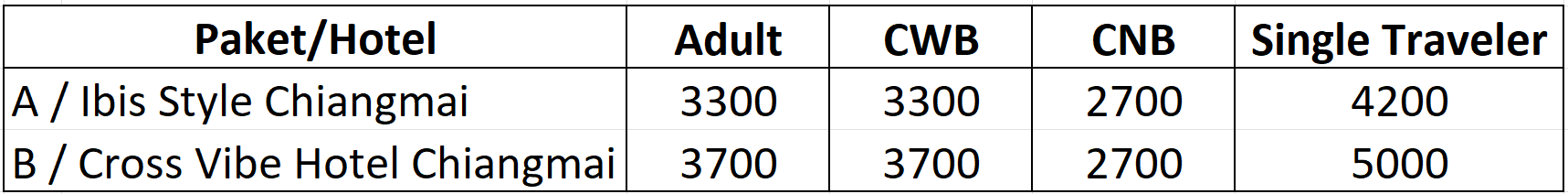 Tiba di Bandara Chiang Mai. Setelah cap paspor di imigrasi Thailand. Anda akan bertemu dengan perwakilan kami di pintu keluar. Anda akan ditransfer ke hotel untuk check in dan acara bebas.