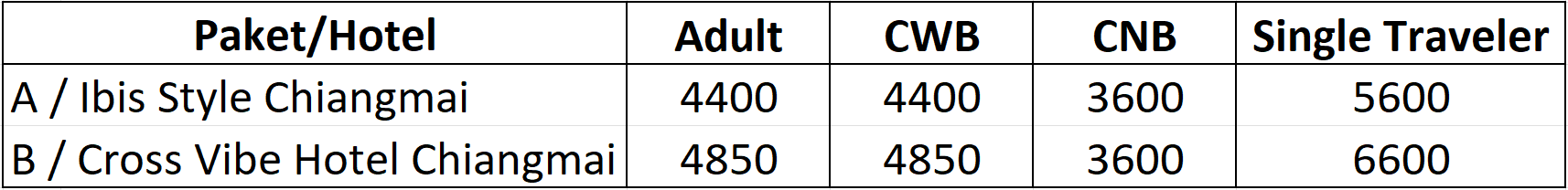 Tiba di Bandara Chiang Mai. Setelah cap paspor di imigrasi Thailand. Anda akan bertemu dengan perwakilan kami di pintu keluar. Anda akan ditransfer ke hotel untuk check in dan acara bebas.