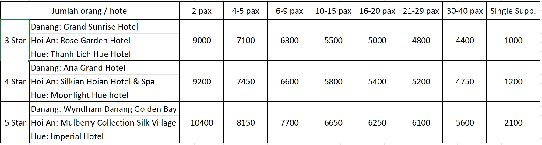 Paket tour Danang Vietnam menghadirkan pengalaman liburan penuh warna dengan perpaduan pantai eksotis, panorama alam yang memukau, serta pesona budaya yang unik. Anda akan diajak menikmati keindahan Pantai My Khe yang terkenal, menjelajahi Marble Mountain yang sarat nilai spiritual, hingga berfoto di Golden Bridge yang ikonik. Ditambah dengan kuliner khas dan suasana kota modern yang hangat, perjalanan ini menjadi pilihan tepat untuk liburan yang menyenangkan dan berkesan di Vietnam.