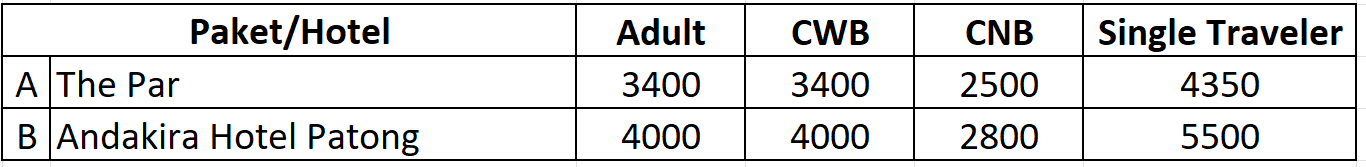 Tiba di Bandara Phuket. Setelah cap paspor di imigrasi Thailand. Anda akan bertemu dengan perwakilan kami di pintu keluar. Anda akan ditransfer ke hotel untuk check in dan acara bebas.