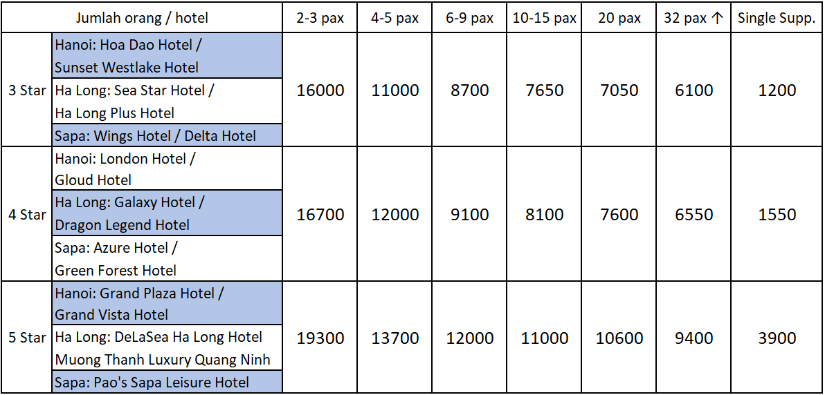 Paket Tour Vietnam 6 Hari 5 Malam menawarkan perjalanan seru melintasi berbagai kota dan destinasi favorit, dari keelokan alam Ha Long Bay yang memukau, jejak sejarah Hanoi yang memikat, hingga dinamika kehidupan pegunungan Sapa. Setiap harinya, Anda akan disuguhkan pengalaman berbeda, mulai dari wisata budaya, kuliner khas, hingga panorama alam yang tak tertandingi. Dengan kombinasi lengkap ini, liburan Anda di Vietnam akan menjadi momen indah yang selalu terkenang. Hanoi Halong Sapa Fansipan terbaru yang telah dikunjungi ratusan ribu wisatawan dalam kurun waktu 3 Bulan. Terkenal dengan tempat wisata baru yaitu Sapa Vietnam yang berudara sejuk dan dingin. Booking segera untuk bergabung dengan tour kami.